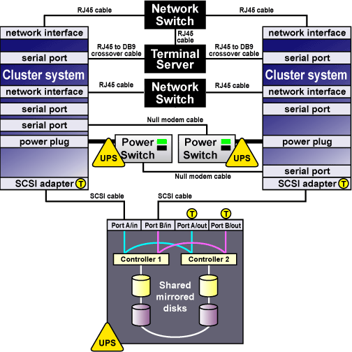 Figure 2-1 shows an example of a no single point of failure hardware configuration that includes the previously-described hardware, two single-initiator SCSI buses, and power switches to guarantee data integrity under all error conditions. A "T" enclosed in a circle represents a SCSI terminator.