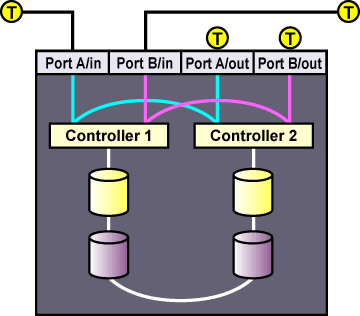 Figure 2-9. Dual-controller RAID Array Connected to Single-initiator Fibre Channel Interconnects