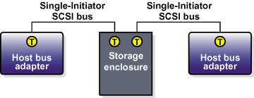 Setting host bus adapter termination is usually done in the adapter BIOS utility during member boot. To set RAID controller termination, refer to the vendor documentation. Figure 2-5 shows a configuration that uses two single-initiator SCSI buses.