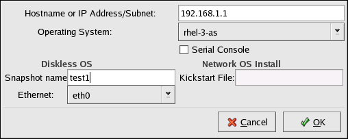 After completing the steps in Section 15.4 Finish Configuring the Diskless Environment, a window appears to allow hosts to be added for the diskless environment. Click the New button. In the dialog shown in Figure 15-1, provide the following information: