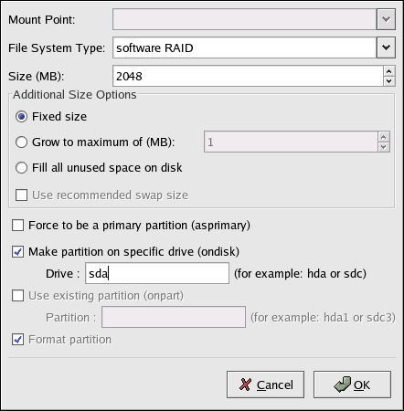 3. Configure the partitions as previously described, except select Software RAID as the file system type. Also, you must specify a hard drive on which to make the partition or specify an existing partition to use.