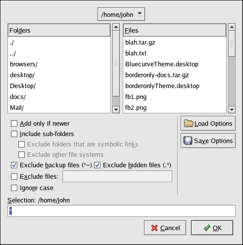 If you need to free some hard drive space, or send multiple files or a directory of files to another user, File Roller allows you to create archives of your files and directories. To create a new archive, click New on the toolbar. A file browser pops up, allowing you to specify an archive name and the compression technique. For example, you may choose a Tar Compressed with gzip (.tar.gz) format from the drop-down menu and type the name of the archive file you want to create. Click OK and your new archive is now ready to be filled with files and directories. To add files to your new archive, click Add, which opens a browser window (Figure 4-2) that you can navigate to find the file or directory you want to be in the archive. Click OK when you are finished, and click Archive => Close to close the archive.