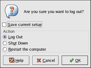 To quit the graphical desktop, select the Log Out menu item from the Main Menu. This brings up a dialog which presents you with the options listed above.