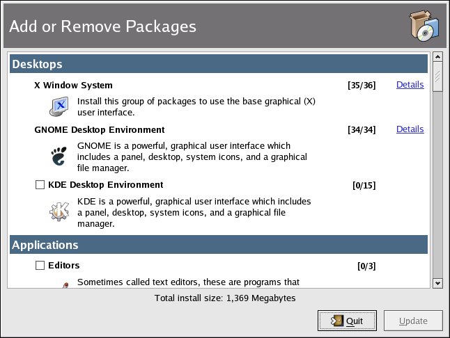 The main window shows a list of package groups. If the package group has a checkmark in the checkbox beside it, packages from that group are currently installed. To view the individual packages list for a group, click the Details button beside it. The individual packages with a checkmark beside them are currently installed.