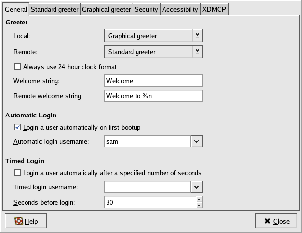 For more detailed information regarding the configuration of gdm, the Gnome Display Manager, refer to the Gnome Display Manager Reference Manual available within the online help system through Applications (the main menu on the panel) => Help, in the Desktop Category.