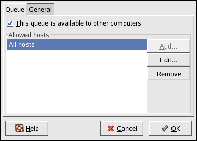 After selecting to share the queue, by default, all hosts are allowed to print to the shared printer. Allowing all systems on the network to print to the queue can be dangerous, especially if the system is directly connected to the Internet. It is recommended that this option be changed by selecting the All hosts entry and clicking the Edit button to display the window shown in Figure 34-18.