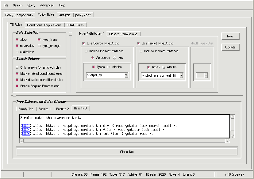 The search parameter tabs Types/Attributes and Classes/Permissions let you describe details about the source and target you are analyzing. An asterisk * appears on the tab if a parameter from that tab is set and affecting the search. You can define the source by using the exact type or using a regular expression. Automatically, the expression is anchored at both ends, so a caret ^ and dollar sign $ surround the search terms unless you explicitly change them.