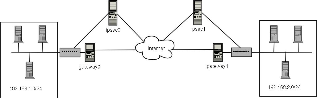 For example, suppose LAN A (lana.example.com) and LAN B (lanb.example.com) want to connect to each other through an IPsec tunnel. The network address for LAN A is in the 192.168.1.0/24 range, while LAN B uses the 192.168.2.0/24 range. The gateway IP address is 192.168.1.254 for LAN A and 192.168.2.254 for LAN B. The IPsec routers are separate from each LAN gateway and uses two network devices: eth0 is assigned to an externally-accessible static IP address which accesses the Internet, while eth1 acts as a routing point to process and transmit LAN packets from one network node to the remote network nodes.