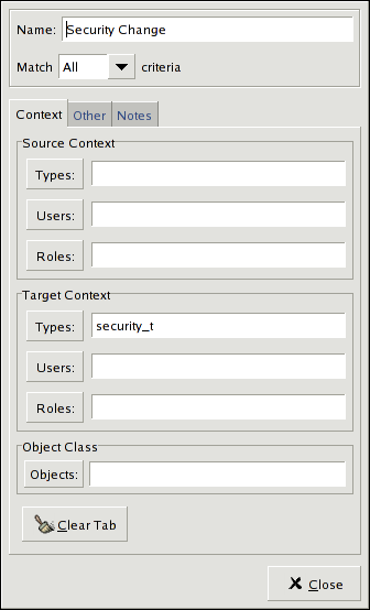 Figure 6-4. seaudit Editing Filters Select Target Types Window