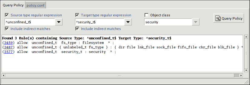 With the policy loaded into the policy.conf tab, your query results include a number in parenthesis, for example, (3577). These numbers are hyperlinks to the corresponding line number in the policy.conf file. Clicking on the hyperlink takes you directly to the location in the policy.conf tab.