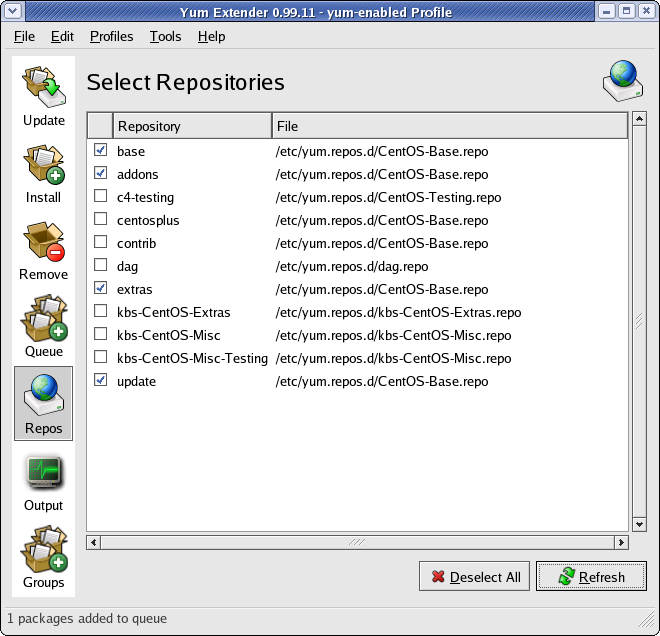 and enabled will be checked. Repositories in those above locations that are disabled will be unchecked. You may check or uncheck repositories and then use the Refresh button to recalculate the package information.