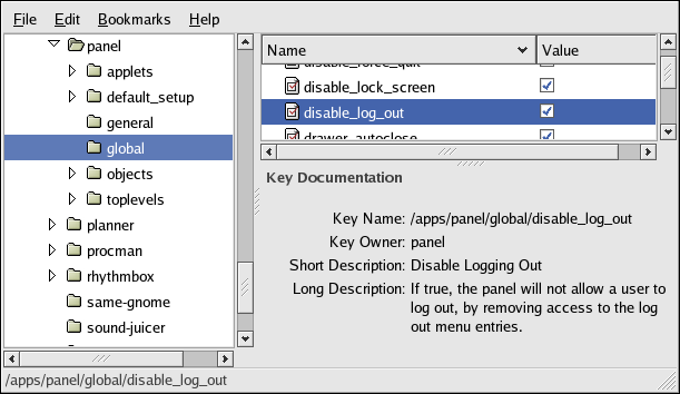 Figure 4-1. Using GConf editor to disable Log Out and Lock screen