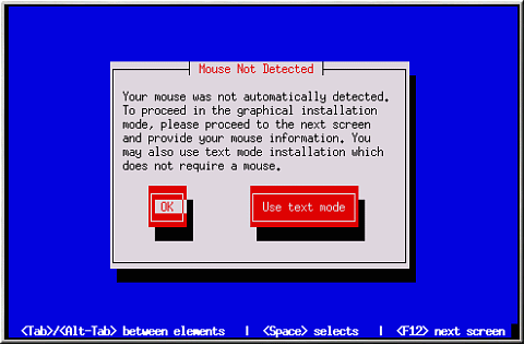 You can choose to continue with the GUI installation or use the text mode installation, which does not require using a mouse. If you continue with the GUI installation, you are prompted to provide the installation program with your mouse configuration information.