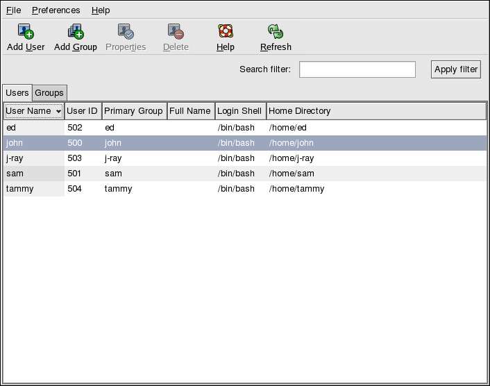 You can also start the User Manager by typing redhat-config-users at a shell prompt.